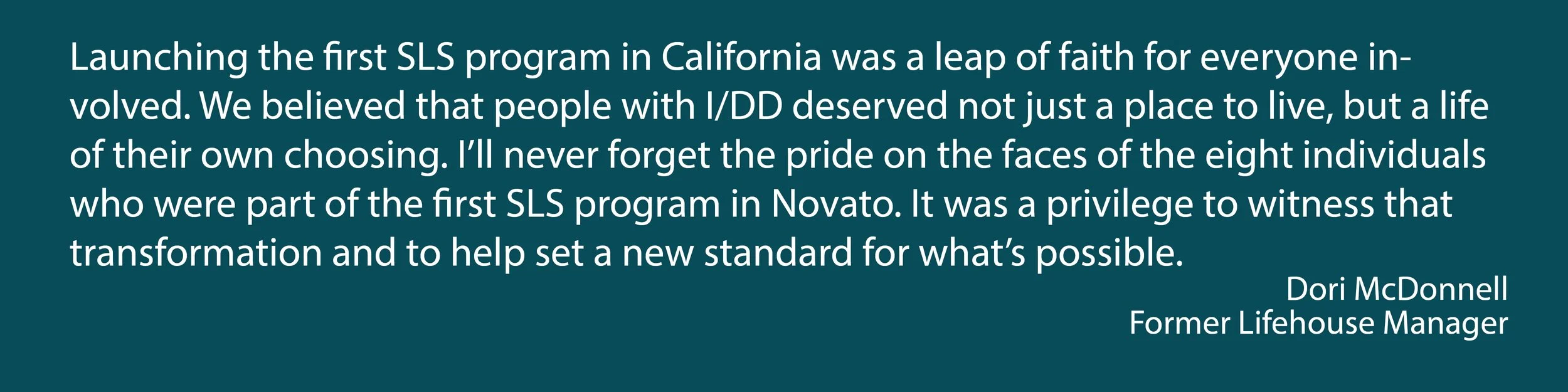 Nancy brought with her a unique perspective. Prior to her work in California, she had been involved in the very first SLS program in Massachusetts. She recognized that while California had a strong service network, it lacked a crucial piece, support that allowed people with I/DD to move beyond institutional or group living and into fully integrated community life. Seeing the need and the potential, Nancy authored a Request for Proposal (RFP) in 2003 to the Golden Gate Regional Center to launch a supported living model through Lifehouse. The proposal was approved, and with it, a movement was born.